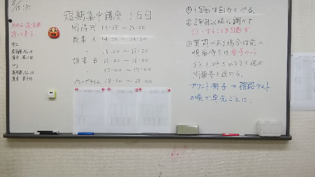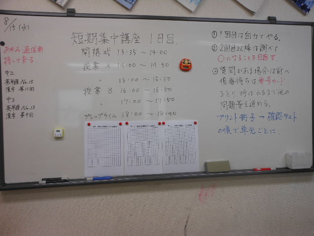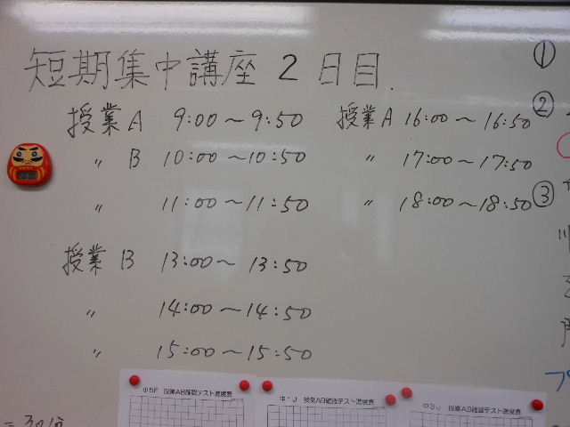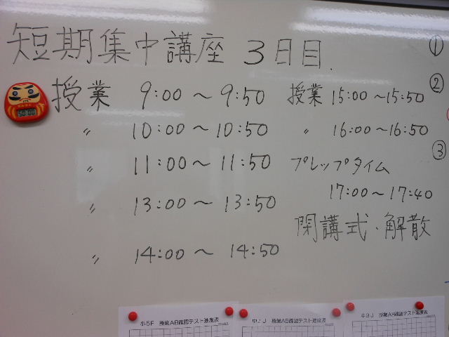 午後、いよいよ3日間のでのヤマ場、授業B 50分×3コマ、授業A 50分×3コマとなります。と気合いを入れる訓話が終わる頃、残念ながら日帰り組のうち1名が遅刻(T-T)合宿だったらイエローシールものでした。