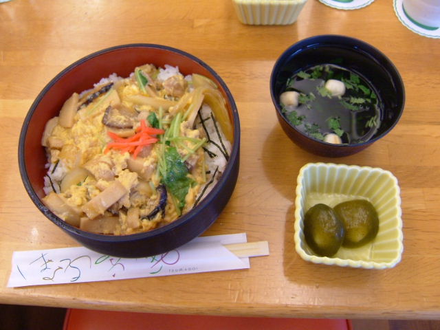 親子丼、お茶の餅菓子、お吸い物