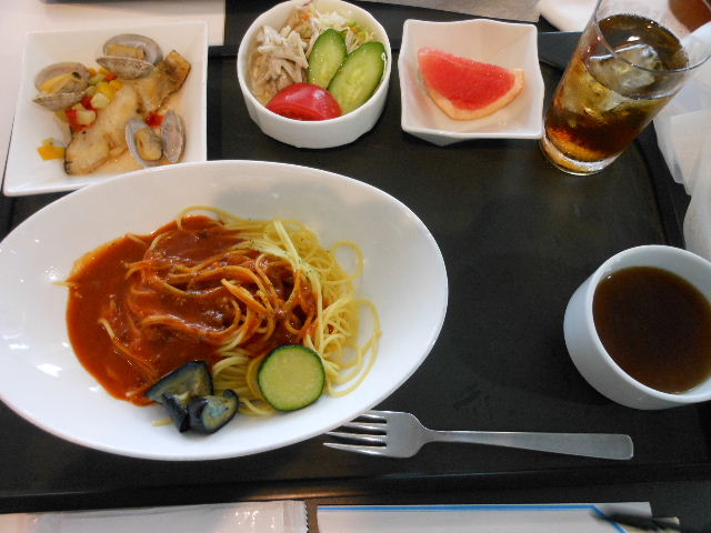 スパゲティミートソース 白身魚とアサリのビネグレッドソース ごぼうサラダ オニオンスープ フルーツ