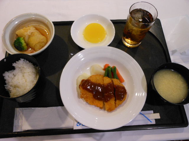 ロースカツレツデミソース ロールキャベツのトマト煮込み 卵のスープ ご飯 カップゼリー