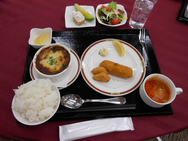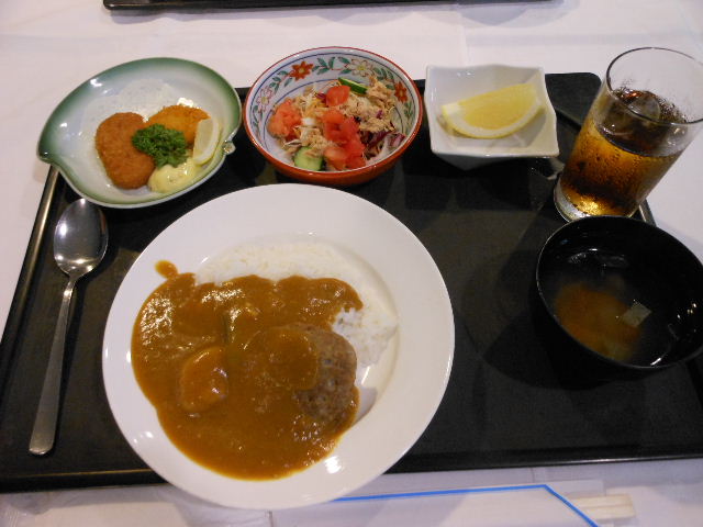 ハンバーグカレー ツナサラダ カニコロッケと帆立フライ 野菜スープ フルーツ