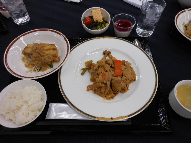 <昼食メニュー> 豚肉のスタミナ炒め メバルのポン酢添え わかめサラダ 杏仁豆腐 たまごスープ ご飯
