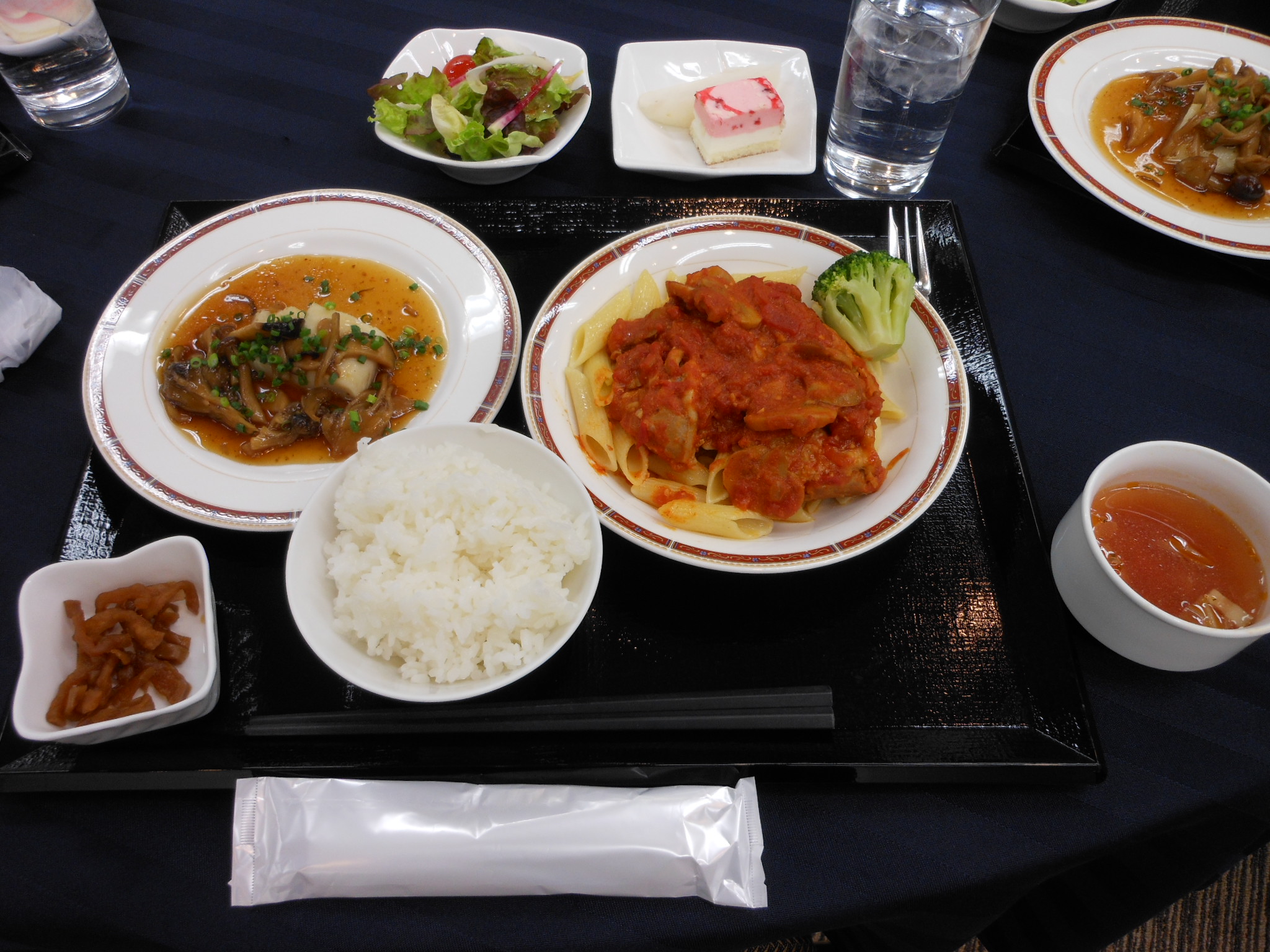 チキンのトマト煮込みソースがけペンネ カラスガレイ白ワイン蒸しキノコ南蛮ソースがけ