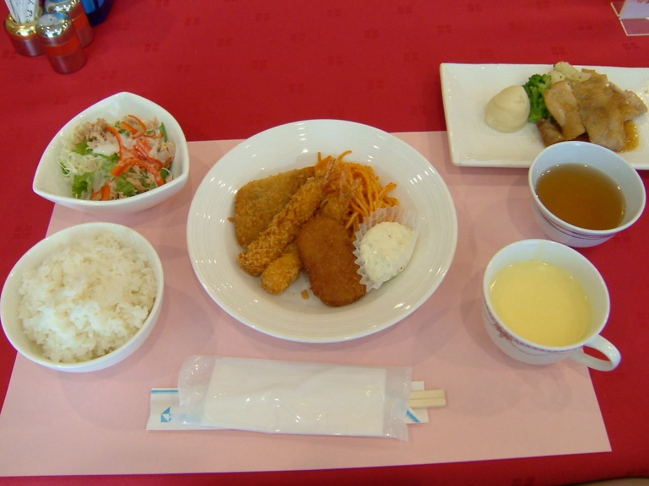 ミックスフライ 鶏のグリル ツナサラダ ライス コーンスープ