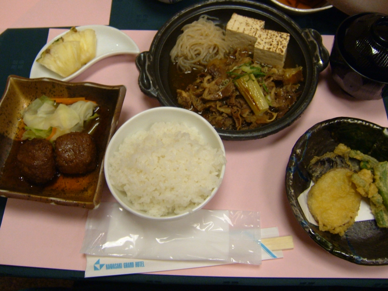すきやき 肉団子の照り焼き 野菜のてんぷら ご飯 お味噌汁 パイン