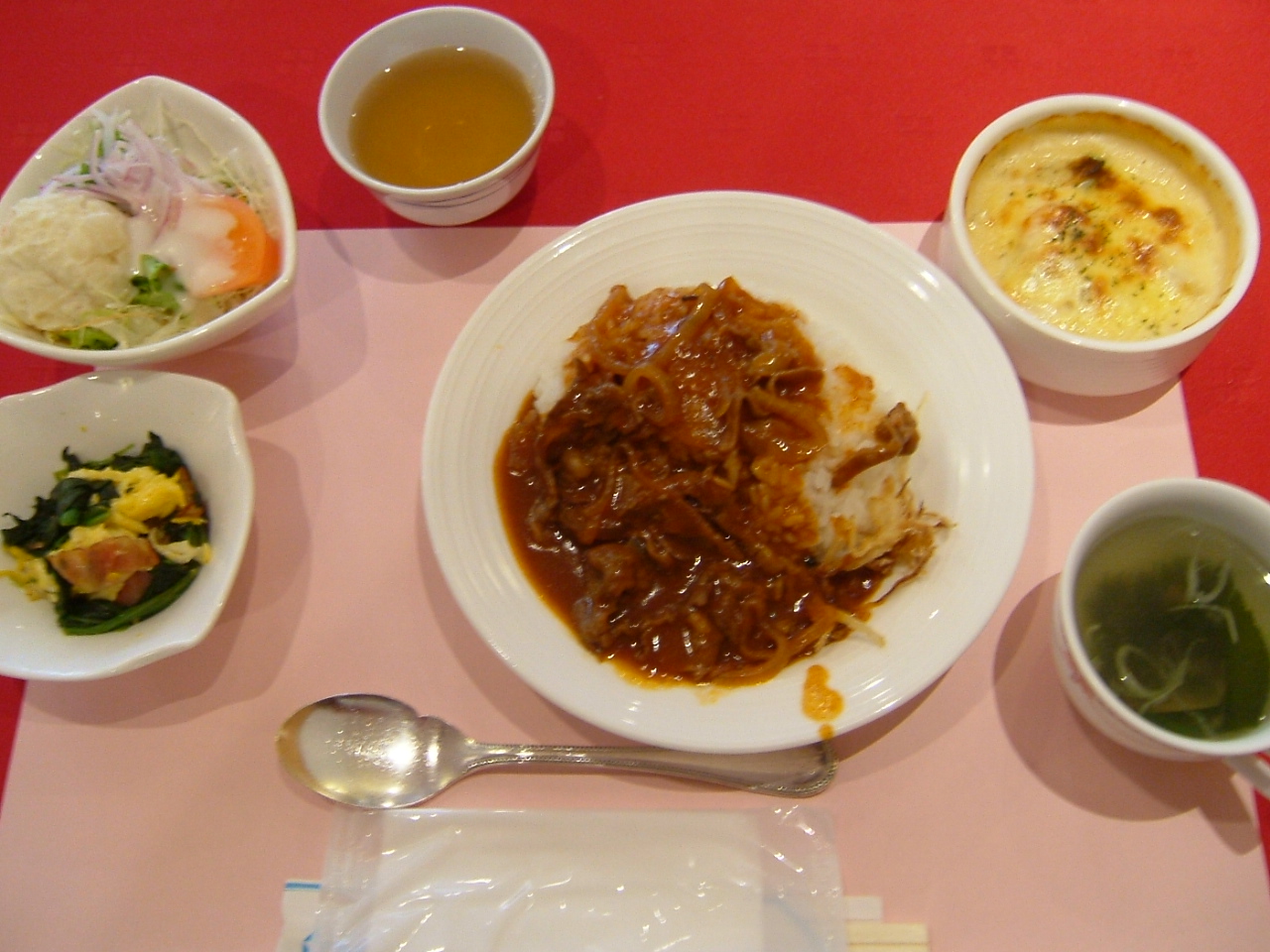 ハヤシライス 白身魚のグラタン 卵とベーコンの炒め物 ポテトサラダ ワカメスープ