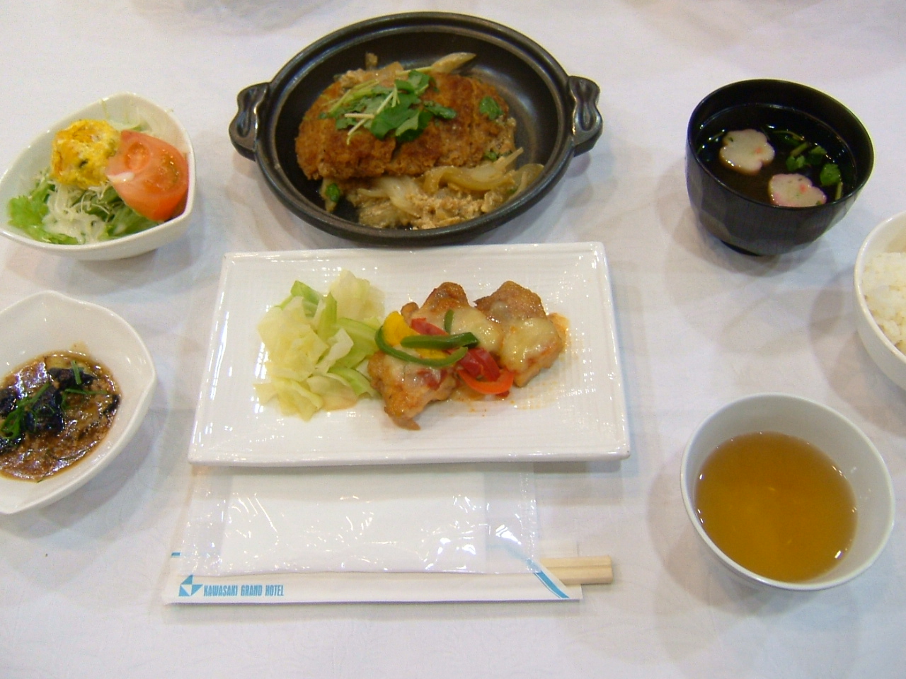 カツの卵とじ 鶏のチーズ焼き カボチャサラダ 茄子のそぼろあんかけ ご飯 お吸い物
