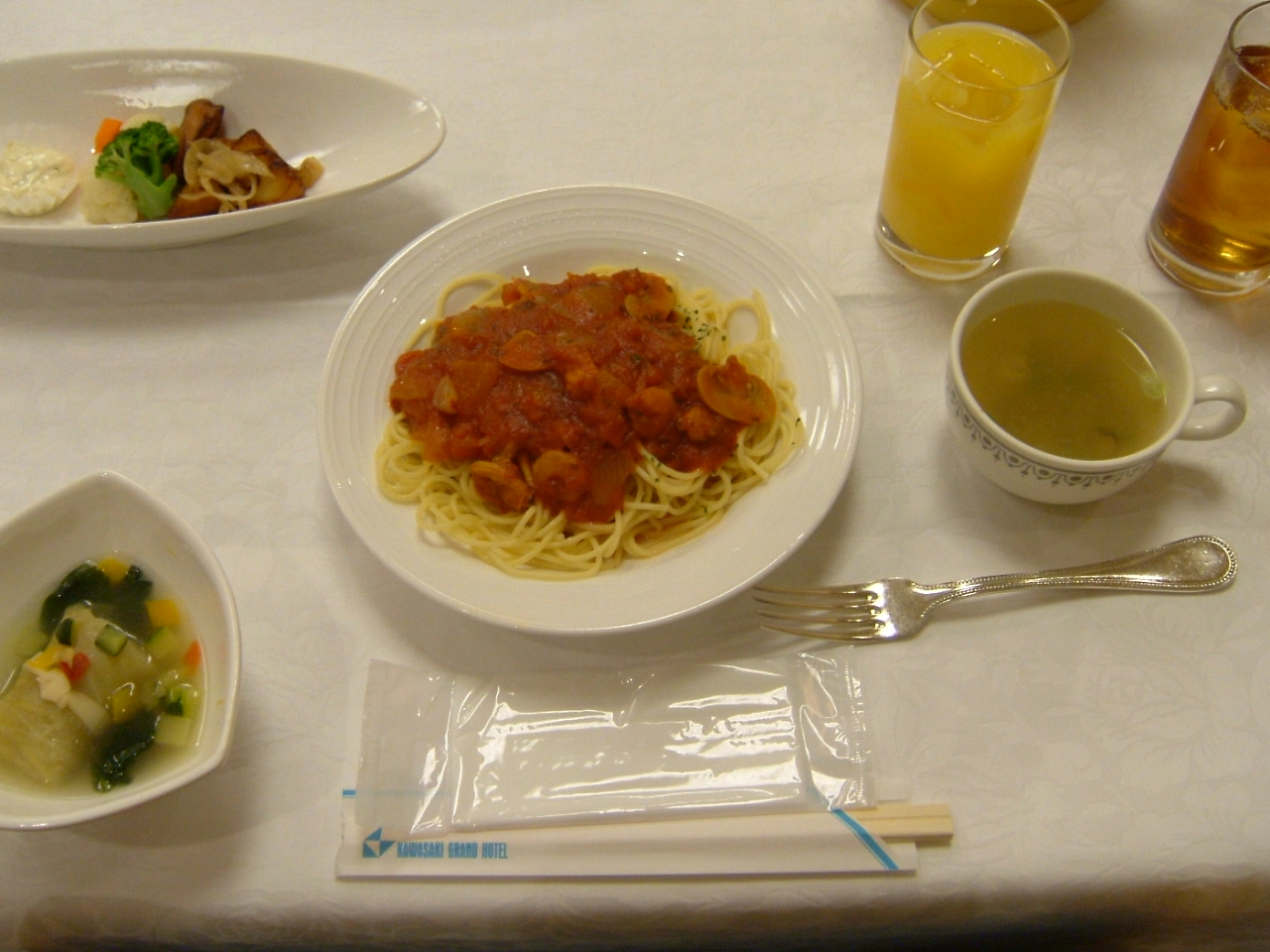 魚介のスパゲティ ミニロールキャベツ ジャーマンポテト 温野菜 きのこスープ お楽しみケーキ・ジュース