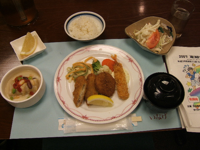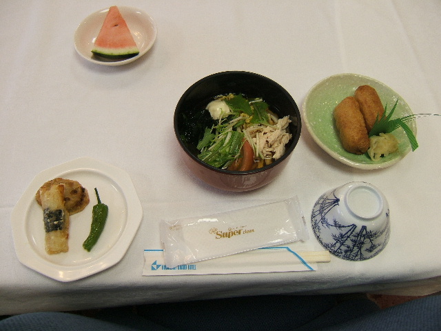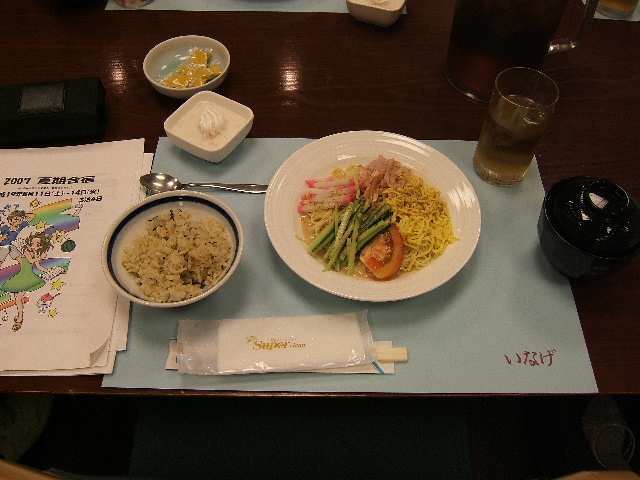 <昼食メニュー>サラダうどん・山芋の磯辺揚げ・蓮根のはさみ揚げ・稲荷寿司・すいか