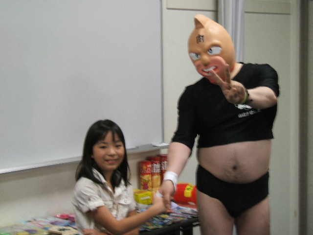 確認テスト終了後は、恒例のビンゴ大会です。今年は、ダースベイダー(?)・Dレンジャーに加え、きん肉マンならぬぜい肉マン(?)も登場し、会場を大いに盛り上げました。