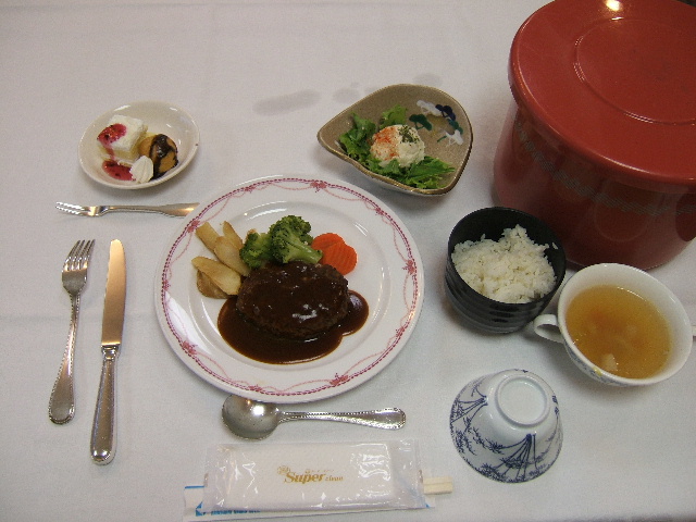 <夕食メニュー>ハンバーグ・ポテトサラダ・ライス・野菜スープ・プチケーキ・プチシュー